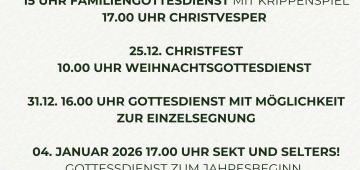 Krippenspiel: Melissa Schuster übernimmt dieses Jahr die Regie fürs Krippenspiel. Am Buß- und Bettag starten wir mit dem Programm. Die verbindlichen Proben für alle Kinder, die gerne mitspielen wollen sind an den darauffolgenden Freitagen...